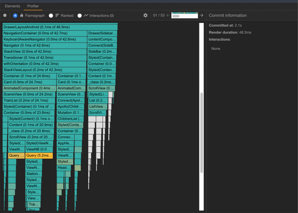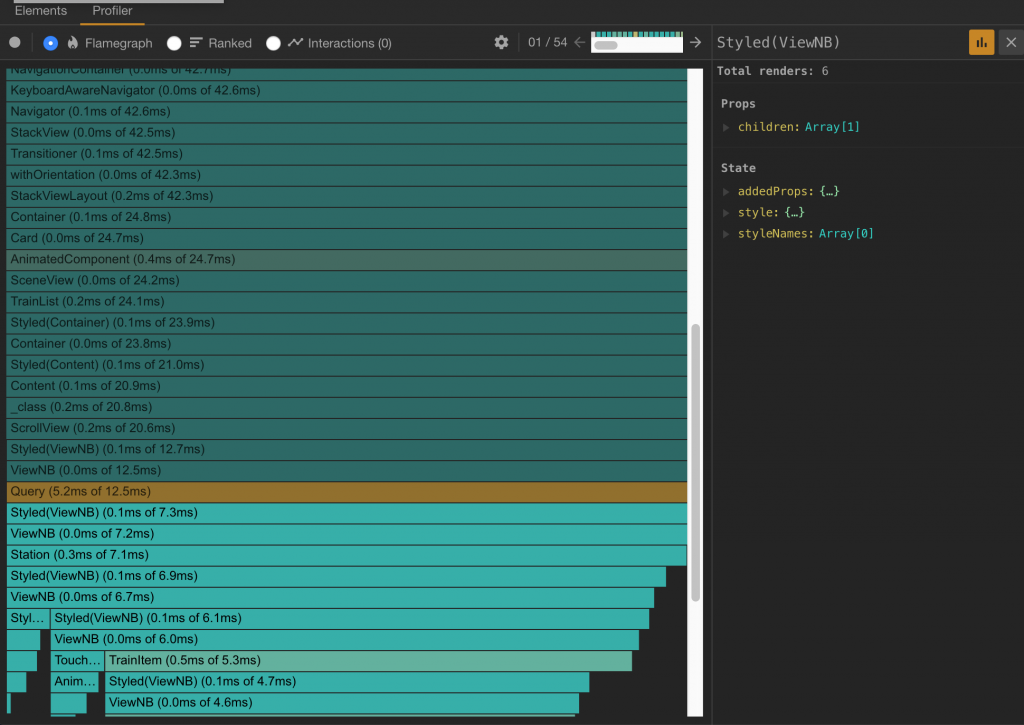 Une des manières d'identifier les composants React qui sont lents ou utilisent le plus de ressource est d'utiliser le Profiler de React Debugger (React Native Debugger dans mon cas). Celui permet de voir au moins 2 métrique important : le nombre de fois qu'un composant est rendu et le le temps qu'un rendu prend.