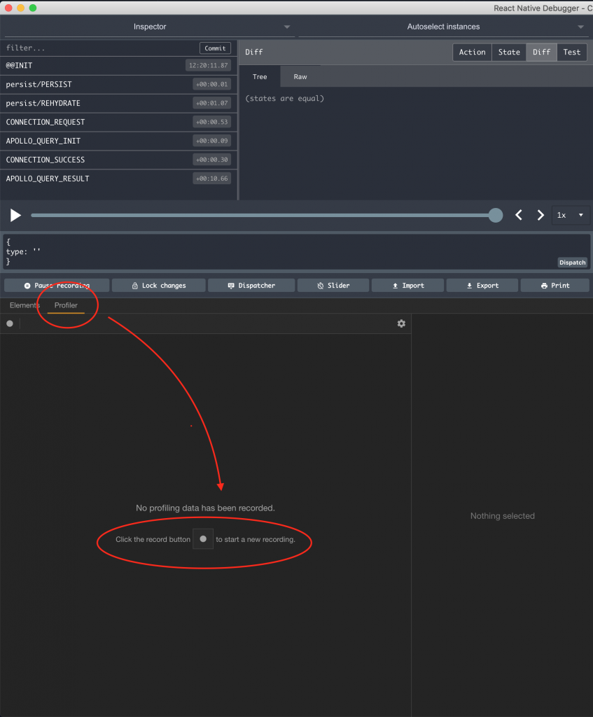 En mesurant ces 2 éléments, on peut voir si les optimisations que nous effectuons sont efficace ou pas. Il faut donc commencer par "Enregistrer" ces informations durant une utilisation normale de l'application. Pour cela, il faut ouvrir React Native Debugger et se rendre sur l'onglet Profiler puis de cliquer sur le bouton "⏺"