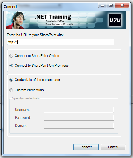 Nous pouvons y voir les balises comme Where, Eq, IsNull, etc... qui permettent de décrire ce que nous voulons avoir comme résultat. Cependant, il peut être difficile de créer "à la main" ces requêtes, surtout quand il faut récupérer différents champs personnalisés et quand les conditions deviennent plus complexes. Il existe plusieurs outils pour remédier à cela. J'ai testé U2U CAML Query Builder qui permet de se connecter à un site SharePoint, d'y trouver la liste sur laquelle on souhaite récupérer les données et construire la requête depuis des listes de sélections. Le logiciel est très simple d'utilisation. Il faut commencer par se connecter à un site SharePoint sur l'interface de démarrage :